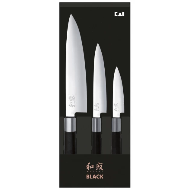 Coffret 3 Couteaux Japonais Universel 10 cm Universel 15 cm et Chef 20 cm Wasabi Black Kai