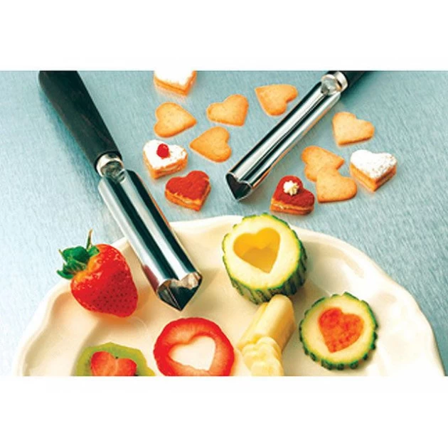L’emporte Coeur permet de creuser des fruits et légumes pour obtenir une forme de coeur. L’emporte coeur peut également être utilisé sur des pâtes ou gâteaux.