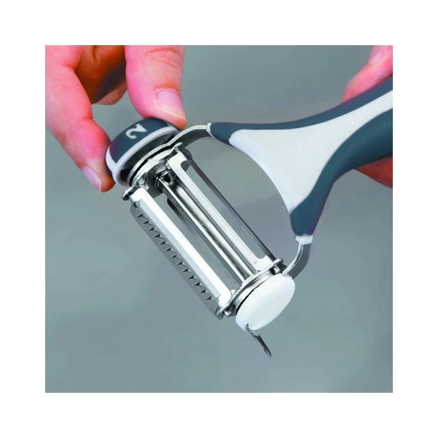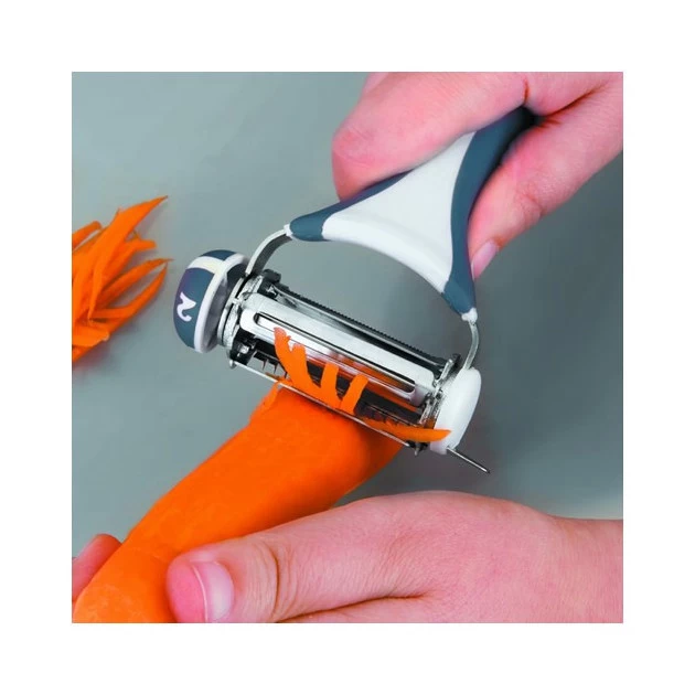 Pratique et utile, il prend peu de place : l’éplucheur à légumes 3 lames est simple à utiliser. Il est composé d’une molette rotatives qui vous permet de changer de lame quand vous le souhaitez… Pour peler vos tomates avec sa lame dentelée, préparer votre julienne de légumes, ou simplement éplucher vos légumes avec sa lame lisse, il répondra à toutes vos envies ! Son manche ergonomique vous promet une prise en main facile et un usage plus que simple.