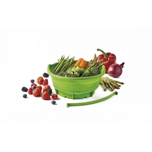Utilisez la Passoire Silicone Rétractable pour égoutter vos aliments, mais pas seulement : elle peut également vous servir à cuire à la vapeur vos légumes ! En effet, la Passoire Pliable s’adapte sur des casseroles de 24 cm de diamètre, devenant ainsi un Panier Cuisson Vapeur avec une anse amovible. De plus, cette Passoire en Silicone supporte les températures de – 40 à 220 °C.