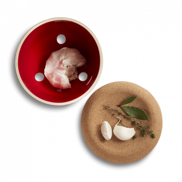 Le mariage des couleurs, entre le liège d’une teinte naturelle et la céramique émaillée, saura vous séduire. Baptisé Grand Cru, en hommage à la région où sont fabriquées les céramiques Emile Henry, c’est un rouge vibrant et aux reflets lumineux qui pare ce pot à ail en céramique.